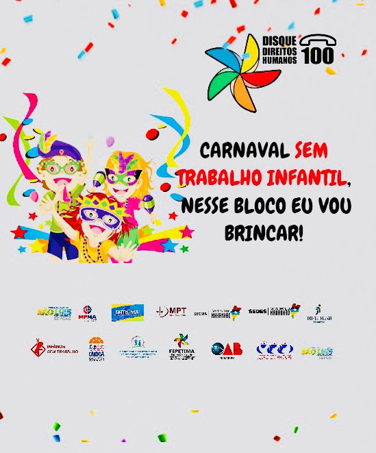 O Tribunal Regional do Trabalho – 16ª Região – em conjunto com outros gestores públicos, está desenvolvendo uma campanha com orientações voltadas ao trabalho infantil durante o Carnaval 2023, do Maranhão.