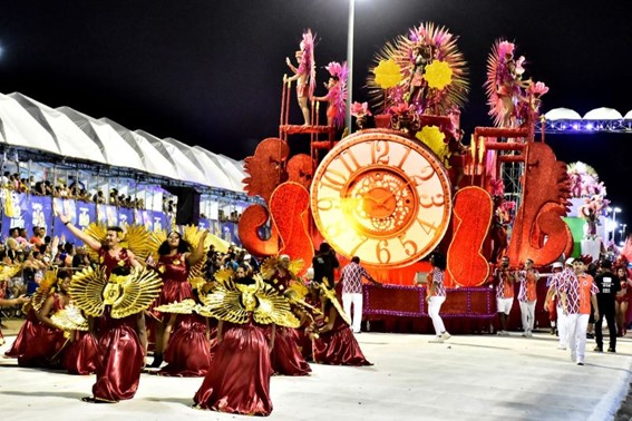 A bateria deu o tom de um desfile que deixou o público extasiado. O carro abre-alas trouxe uma referência ao tempo em um vermelho intenso, o segundo trabalhou com o amarelo e o último com o branco, todos altos e ricamente decorados.