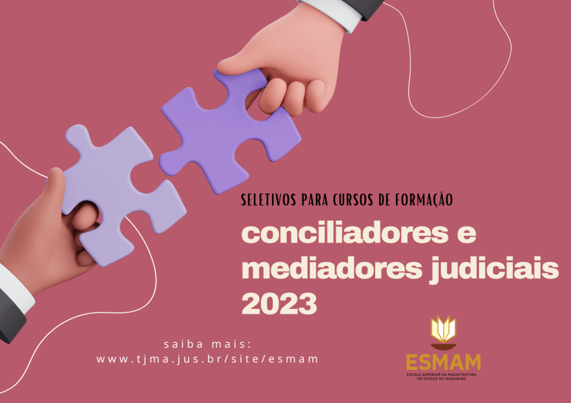 A Escola Superior da Magistratura do Maranhão (ESMAM) e o Núcleo Permanente de Métodos Consensuais de Solução de Conflitos abrem, a partir de 27 de março, inscrições para o processo seletivo do Curso de Formação de Mediadores e Conciliadores Judiciais do Tribunal Justiça do Maranhão (TJMA) para o ano de 2023. De acordo com o Edital ESMAM nº 12023, serão ofertadas 100 vagas, divididas em cinco turmas, (20 alunos cada).