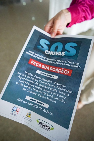 O Grupo de Esposas de Deputados do Maranhão (Gedema), presidido por Carol Duailibe, iniciou a campanha “SOS Chuvas”, no intuito de arrecadar donativos para as famílias afetadas pelas enchentes nos municípios maranhenses. O posto de coleta foi instalado no Hall de entrada da Assembleia Legislativa e as doações poderão ser feitas até o dia 21 de abril.