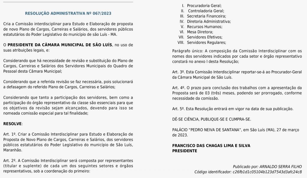 Na semana passada, por meio da Resolução Administrativa n.º 067/2023, o chefe do Legislativo instituiu a comissão interdisciplinar para estudo e elaboração da proposta do novo Plano de Cargos, Carreiras e Salários dos servidores públicos estatutários do Poder Legislativo.