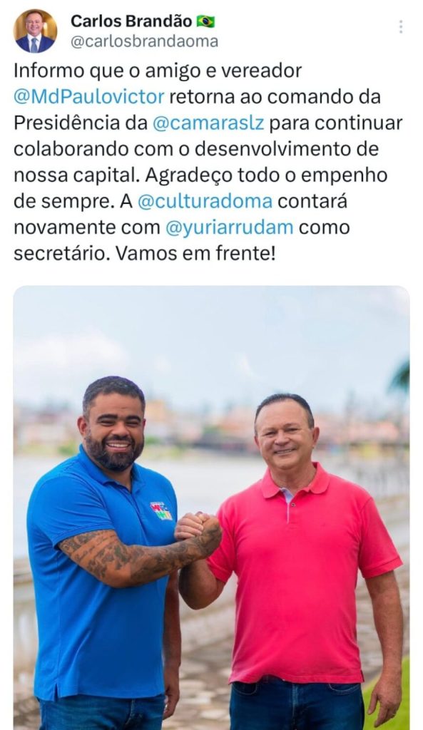 “Informo que o amigo e vereador @MdPaulovictor retorna ao comando da Presidência da @camaraslzpara continuar colaborando com o desenvolvimento de nossa capital. Agradeço todo o empenho de sempre. A @culturadoma contará novamente com @yuriarrudam como secretário. Vamos em frente!”.