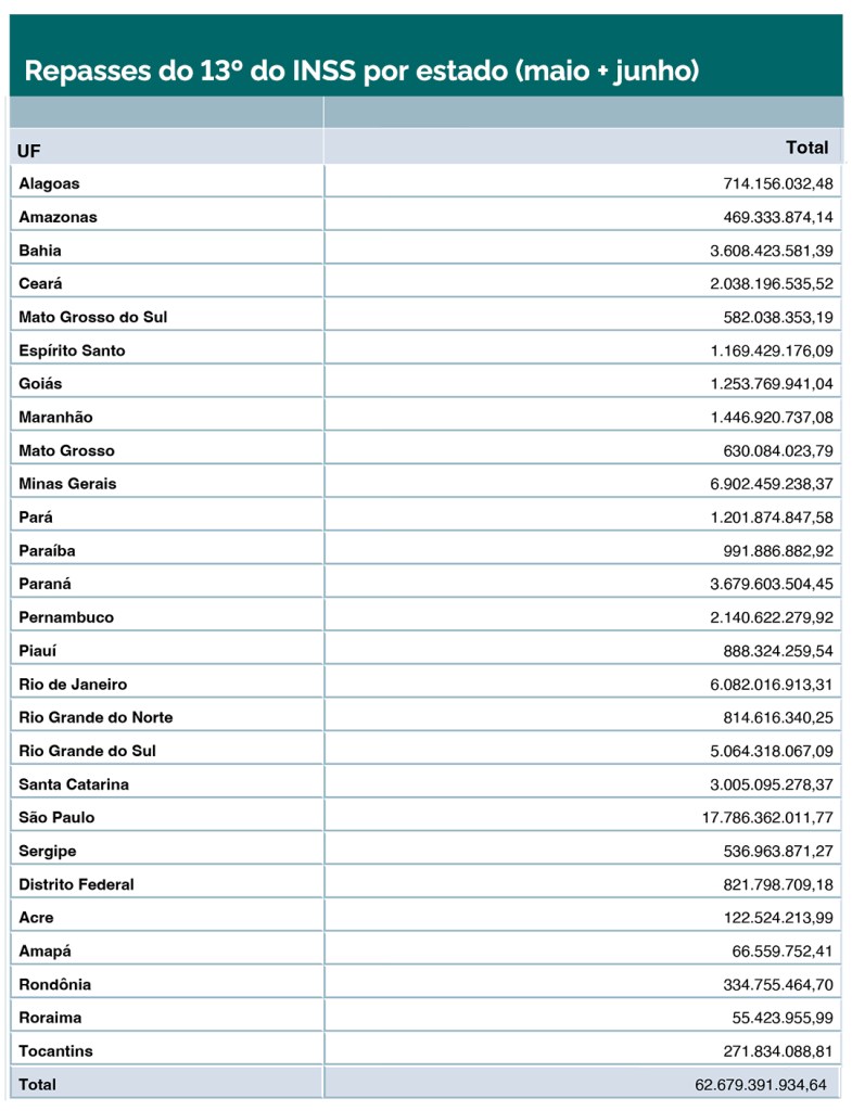 São Paulo é o estado que receberá o maior repasse para pagamento do abono anual levando em conta os dois meses de pagamento. Serão R$ 17,7 bilhões em recursos. Na sequência aparece Minas Gerais, com R$ 6,9 bilhões em repasses, seguido pelo Rio de Janeiro (R$ 6 bilhões), Rio Grande do Sul (R$ 5 bilhões), Paraná (R$ 3,67 bilhões) e Bahia (R$ 3,6 bilhões).