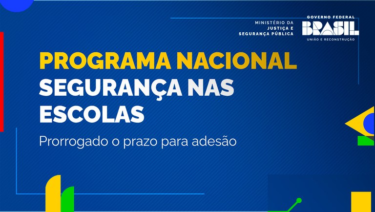 O Ministério da Justiça e Segurança Pública prorrogou o prazo para a adesão ao Programa Nacional Segurança nas Escolas. As novas datas constam no edital nº 7/2023, publicado em edição extra do Diário Oficial da União dessa sexta-feira (28/04). O documento é complementar ao Edital nº 5/2023.