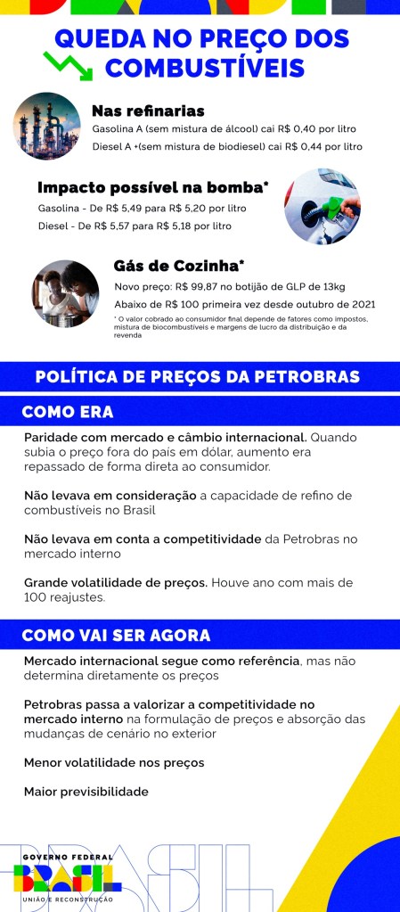 Empresa muda política de preços para levar em consideração condições de refino dentro do país sem perder competitividade e rentabilidade. Valor da redução por litro nas refinarias é de R$ 0,40 na gasolina e R$ 0,44 no diesel. Gás fica abaixo de R$ 100 pela primeira vez desde 2021