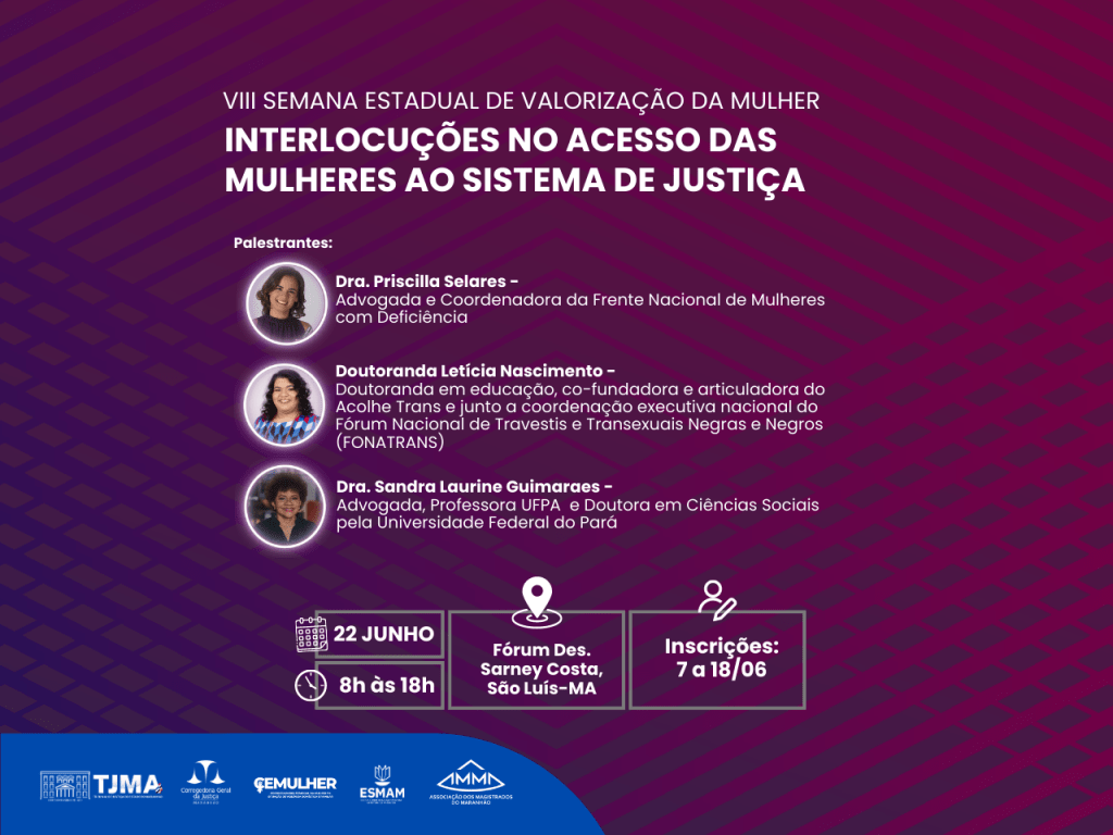 São 300 vagas disponíveis para o evento presencial, que acontecerá no Auditório Madalena Serejo, no Fórum de São Luís (Calhau), das 8h às 12h e das 14h às 18h. As inscrições estarão abertas de 7 a 18 de junho, para o público interno do TJMA no sistema Tutor. O público externo deve acessar o formulário eletrônico disponível abaixo para garantir a participação.