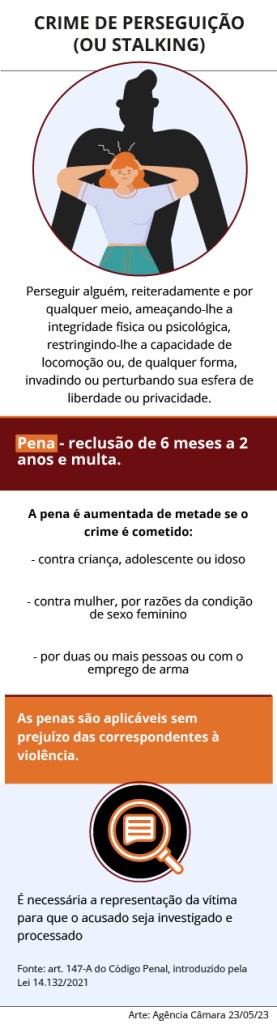 “A perseguição ou stalking, termo em inglês, designa uma forma de violência por meio de perseguição excessiva que rouba a privacidade da vítima e a coloca em situação de medo”, explica o ex-deputado Ney Leprevost (PR), que foi autor da proposta. “Em alguns casos, as perseguições on-line tomam proporções tão grandes que causam danos irreparáveis à vítima”, ressalta.
