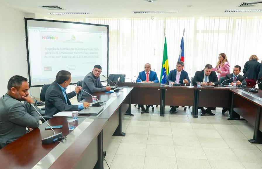 A reunião foi iniciada com a exibição de vídeo institucional sobre os trabalhos de cálculos para rateio do ICMS. Os auditores fiscais Jomar Fernandes, Adalzenir da Silva Braga e Gustavo de Souza de Oliveira Victorio explicaram como será feita a projeção para a distribuição da cota-parte do ICMS para os 217 municípios maranhenses, a partir de 2024.