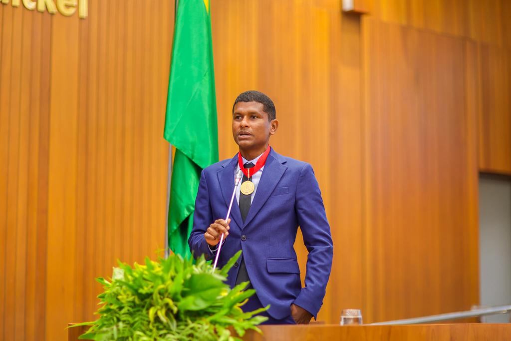 A Assembleia Legislativa do Maranhão concedeu, na manhã desta quinta-feira (30), Medalha do Mérito José de Ribamar Oliveira “Canhoteiro” a Márcio Rodrigues Araújo, ex-jogador profissional de futebol, maranhense de São Luís. A proposição é de autoria do deputado Leandro Bello (Podemos). A comenda é entregue a pessoas cujos trabalhos ou ações mereçam especial destaque na defesa e promoção do desporto.