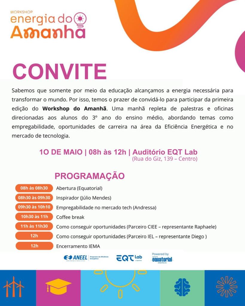 Ocorre nesta sexta-feira (10), das 08h às 12h, no EQT Lab, Hub de Inovação do Grupo Equatorial, o “I Workshop Energia do Amanhã”. O evento foi desenvolvido para atender as demandas de tecnologia e inovação com foco no preparo de alunos da rede pública de ensino para as oportunidades futuras, com o objetivo de aumentar as possibilidades desses estudantes entrarem no mercado de trabalho.