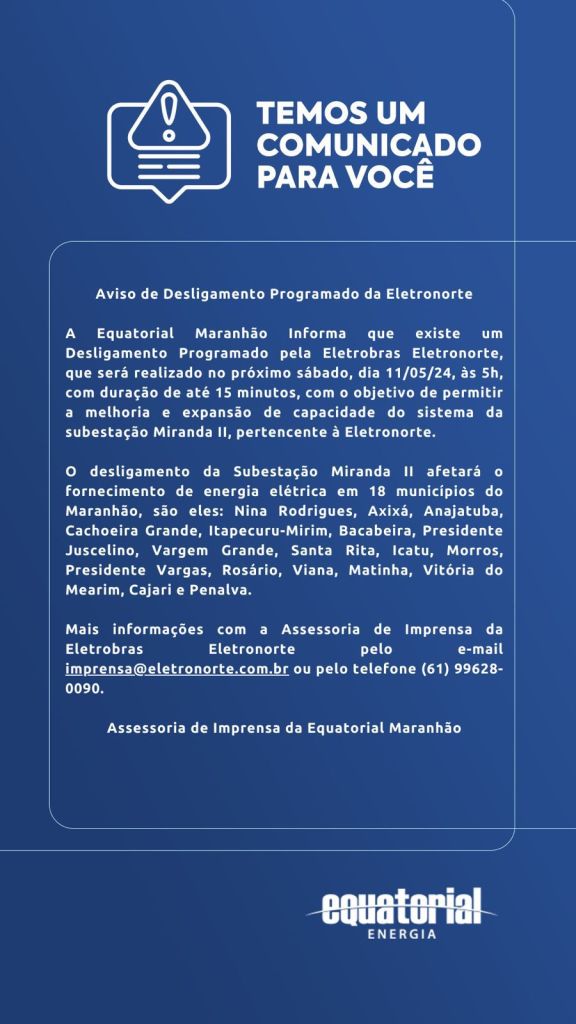 A Equatorial Maranhão Informa que existe um Desligamento Programado pela Eletrobras Eletronorte, que será realizado no próximo sábado, dia 11/05/24, às 5h, com duração de até 15 minutos, com o objetivo de permitir a melhoria e expansão de capacidade do sistema da subestação Miranda II, pertencente à Eletronorte.