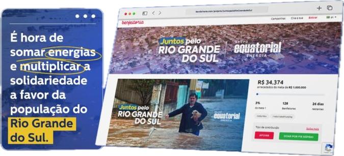 O Grupo Equatorial Energia lançou uma campanha de financiamento coletivo, do tipo matchfunding, para auxiliar na reconstrução do Rio Grande do Sul, após as fortes chuvas que deixaram mais de 500 mil pessoas desalojadas. Neste modelo de doações, a empresa promotora multiplica a doação feita pelo coletivo até o alcance da meta. Ou seja: a cada real doado, a empresa contribuirá com igual valor, dobrando o impacto das doações e multiplicando a esperança daqueles que mais precisam no momento.
