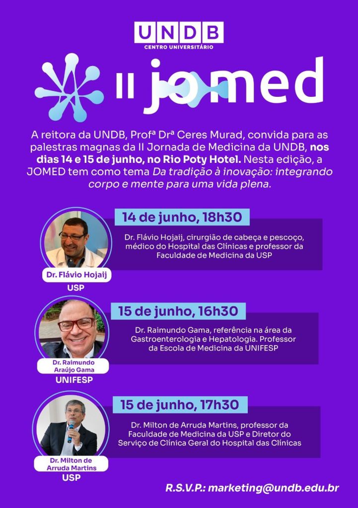 Essa semana, nos dias 14 e 15 de junho o Rio Poty Hotel vai receber acadêmicos, professores e renomados profissionais de medicina, com destaque nacional e internacional, na programação da II JOMED / Jornada de Medicina; evento promovido pelo Centro Universitário UNDB em São Luís, para todos os alunos e profissionais da área da saúde interessados em desenvolver suas habilidades e construir networking de qualidade.