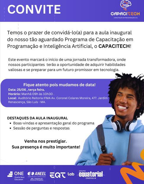 Nesta terça-feira (25), às 9h, ocorre no auditório da Reitoria do IFMA (Av. Colares Moreira, Nº 477, no bairro Renascença II) a aula inaugural do Programa de Capacitação em Programação e Inteligência Artificial, o CAPACITECH, promovido pela Equatorial Maranhão, através do programa E+ Profissional e EQT Lab (laboratório de Inovação do Grupo Equatorial).