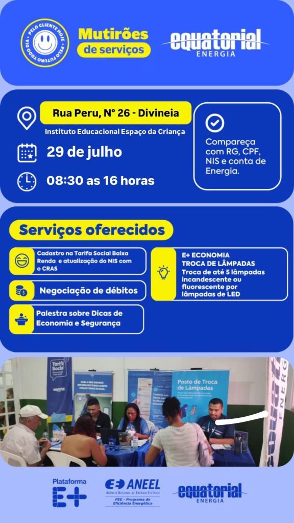 No dia 29 de julho (segunda-feira), a comunidade do bairro Divineia, receberá o Mutirão “Pelo Cliente Todo Dia”, um conjunto de serviços oferecidos pela Equatorial Maranhão, com diversos atendimentos gratuitos. Na ação, a comunidade contemplada poderá trocar lâmpadas incandescentes ou fluorescentes por novas de LED, além de realizar cadastro e atualização na Tarifa Social Baixa Renda, negociação de débitos, e também facilitará o cadastro da promoção Energia em Dia que está em vigor durante todo o ano.