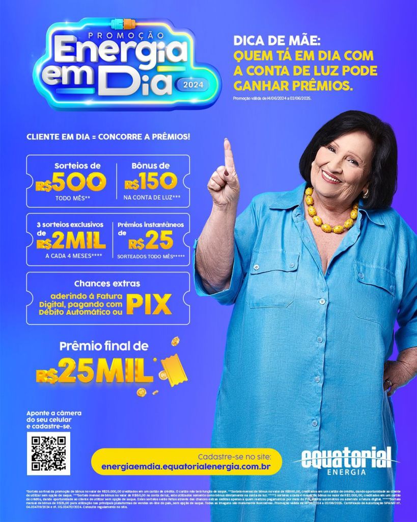 A edição 2024 da promoção “Energia em Dia” vale para todo o estado. A campanha começou no último dia 14 (sexta-feira) e termina em 02/06/2025. Podem participar os clientes pessoa física, cadastrados como residencial, e que sejam titular da conta. Para concorrer aos prêmios, o cliente precisa estar adimplente, conhecer todo o regulamento e se cadastrar por meio do hotsite da promoção: energiaemdia.equatorialenergia.com.br/