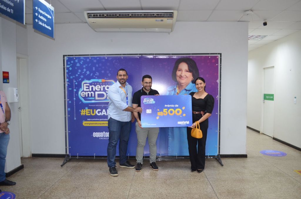 O Grupo Equatorial realizou o primeiro da promoção “Energia em Dia”, campanha da Distribuidora que premia clientes adimplentes em todo o estado. Os primeiros ganhadores do sorteio, Cleber E., Irene S. e Maciel S., são dos municípios de Imperatriz e Timon, respectivamente. Na ocasião, os clientes foram contemplados com bônus de R$ 150 na fatura de energia e R$ 500 em crédito e tiveram ainda a oportunidade de conhecer de perto as instalações e alguns processos da distribuição de energia elétrica, ao visitar a sede da Equatorial.