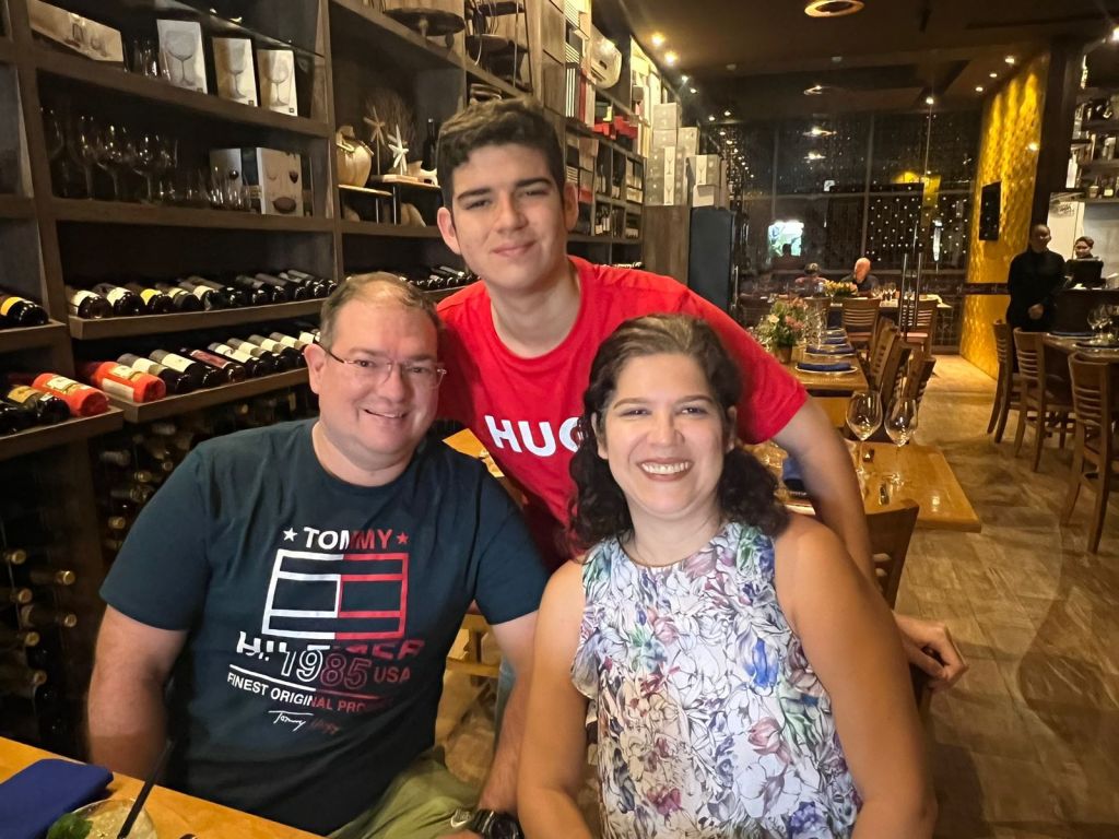 Rafael Duarte celebrando com Carol e Artur na Villa do Vinho Bistrô