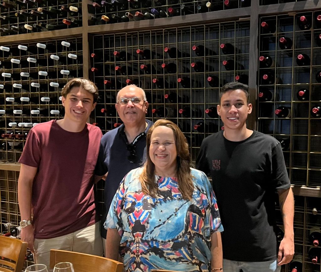 José Domingues Neto com a esposa Danielle Vieira e os filhos Fabrício e MatheusManoela, Adriano e Luis Fernando Salles celebrando em famíliaO anfitrião Werther Bandeira recebendo na Villa do Vinho Fides Ostbye e sua mãe Maria Antônia de Souza, que vieram respectivamente de Marbella (Espanha) e de Imperatriz, para uma breve circulada na Ilha e aprovaram as delícias do restauranteAs amigas Fides Ostbye e Adriana Vieira