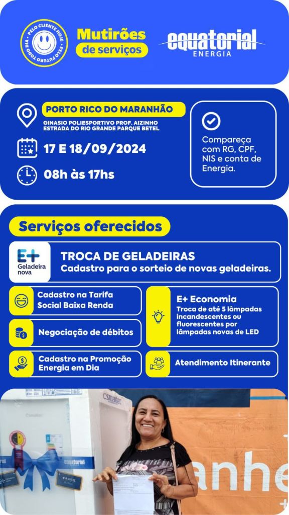 Fomentando o acesso à energia elétrica de forma segura e consciente em todo o estado, por meio de ações colaborativas com a sociedade, a Equatorial Maranhão realiza a partir desta terça-feira (17), mutirão de serviços e cadastro de geladeira nos municípios do Estado.