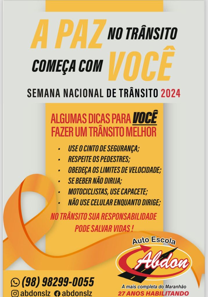 Há 27 anos habilitando os maranhenses com credibilidade e profissionalismo a auto escola Abdon se destaca pela prestação de serviços com qualidade e instrutores competentes. A auto escola Abdon participa da Semana Nacional de Trânsito, que acontece entre os dias 18 e 25 de setembro, com o tema “A paz no trânsito começa por você”.