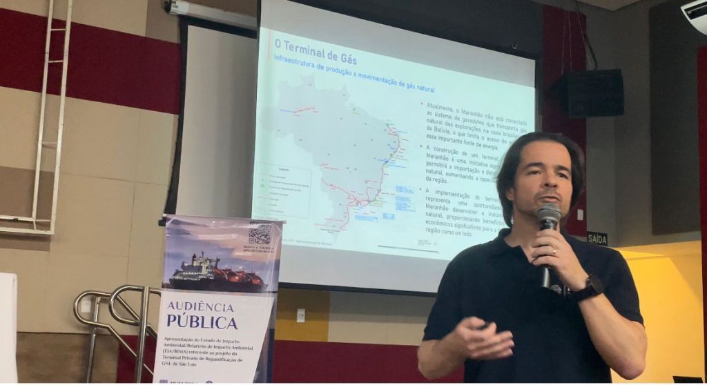Após as explicações do IBAMA sobre o rito da Audiência Pública e quais as fases do licenciamento ambiental e de implantação de empreendimentos; Helder Dantas, Diretor da LC Terminais, iniciou as apresentações técnicas, mostrando os detalhes do Projeto do Terminal Privado de Regaseificação de Gás Natural Liquefeito (GNL) em São Luís, cuja operação será feita totalmente no mar (offshore) e não em terra. “Nosso empreendimento vai ocupar uma pequena área desocupada na Ilha da Boa Razão, e não vai provocar nenhuma desapropriação das famílias que moram nas comunidades vizinhas; e nem terá trânsito de gás nas comunidades, pois toda a operação se dará no mar e dentro de área própria do empreendimento, incluindo uma parte de um gasoduto a ser construído em direção aos clientes finais localizados em sua maioria no Distrito Industrial, e portanto, sem necessidade de passar por dentro de nenhuma comunidade vizinha. Não somos produtores de gás, mas um terminal que vai receber gás importado para ser distribuído e utilizado no Maranhão” tranquilizou Helder Dantas.