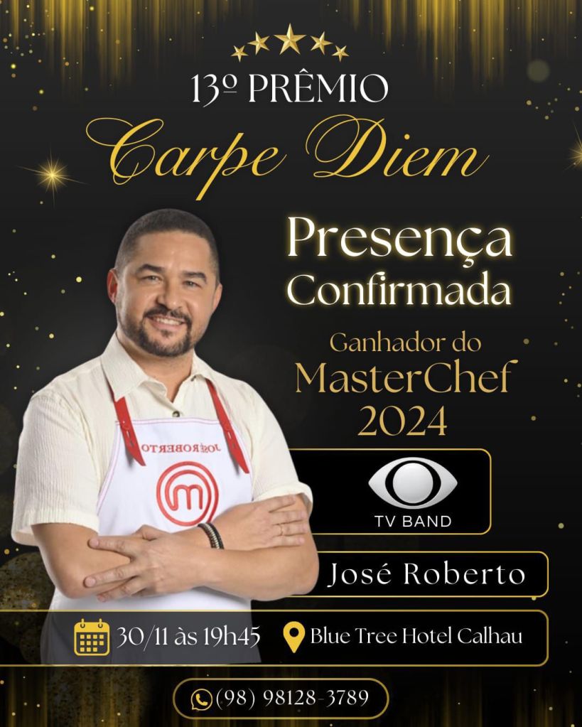 José Roberto, campeão do MasterChef Brasil 2024, mais conhecido como Caju, é um dos homenageados da 13° edição do Prêmio Carpe Diem promovido pelo o apresentador do Programa Top da TV Band Maranhão e Colunista Social do Jornal O Debate William Santos, sem dúvida um dos mais badalados de São Luís do Maranhão. O evento somente para convidados acontece nos salões luxuosos do Blue Tree Hotel Calhau no dia 30 de novembro.