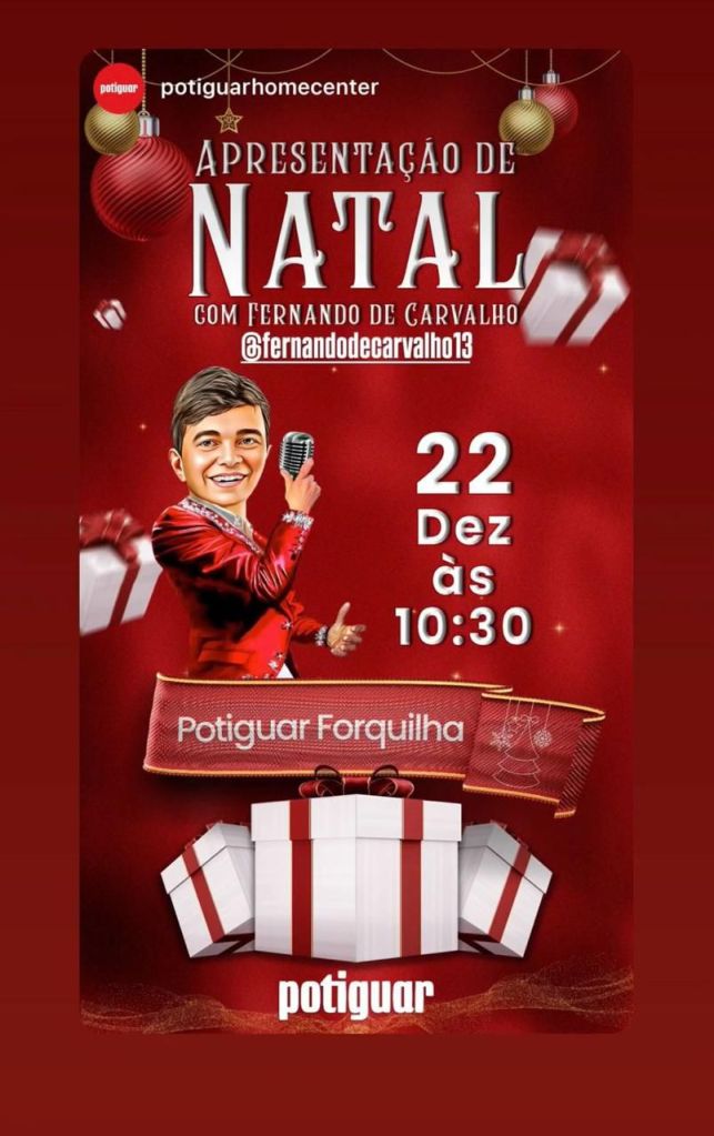 A magia do Natal ganha um toque especial na loja Potiguar da Forquilha nesse domingo (22.12). Às 10h30, o cantor Fernando de Carvalho, um dos artistas mais consagrados da cena musical maranhense, apresenta um pocket show natalino gratuito, repleto de emoção e repertório tradicional desta época do ano, com sua belíssima interpretação de clássicos nacionais e internacionais.