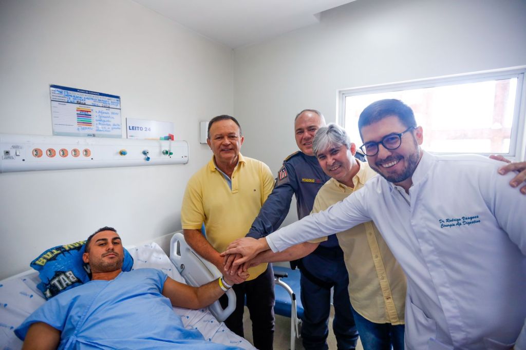 O governador esteve acompanhado do comandante-geral da Polícia Militar, Pitágoras Nunes, do diretor-geral do Hospital Carlos Macieira, Edilson Medeiros, e da equipe médica responsável pelo tratamento. A esposa de Jefferson, Tayane Gois, também esteve presente no momento.