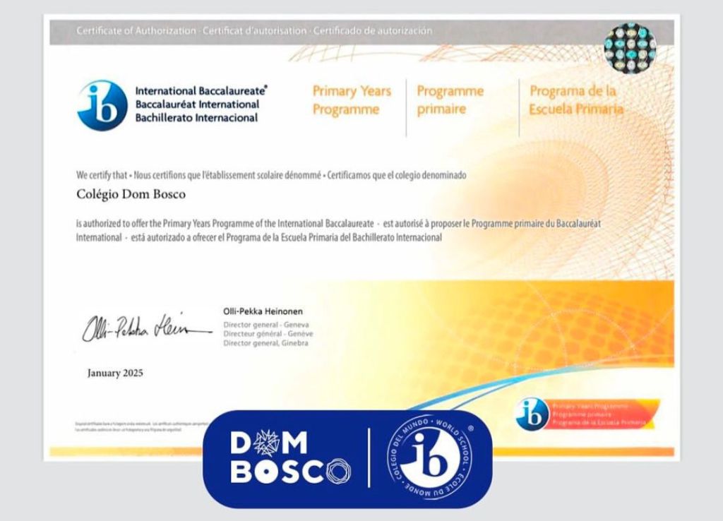 O International Baccalaureate é uma organização educacional fundada há mais de 50 anos em Genebra, na Suíça. Reconhecido em todo o mundo como sinônimo de excelência máxima, o IB realizou “um longo e criterioso processo de avaliação em nossa escola que analisou profundamente o currículo da escola, as metodologias de ensino, o corpo docente, a filosofia escolar, gestão, valores, comunidade escolar e o compromisso com o desenvolvimento integral de nossos alunos”, explicou a Diretora Pedagógica do Dom Bosco Raíssa Murad.