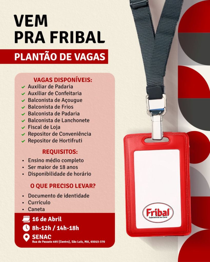 O Grupo Fribal, referência no setor alimentício do Maranhão, promove somente nesta quarta-feira (16.04) uma grande ação voltada para quem busca ingressar no mercado de trabalho: o “Plantão de Vagas Fribal”. Trata-se de um verdadeiro mutirão de recebimento de currículos, que acontece das 8h às 12h e das 14h às 18h, na sede do SENAC, localizada à Rua do Passeio, n.º 495, no Centro de São Luís.