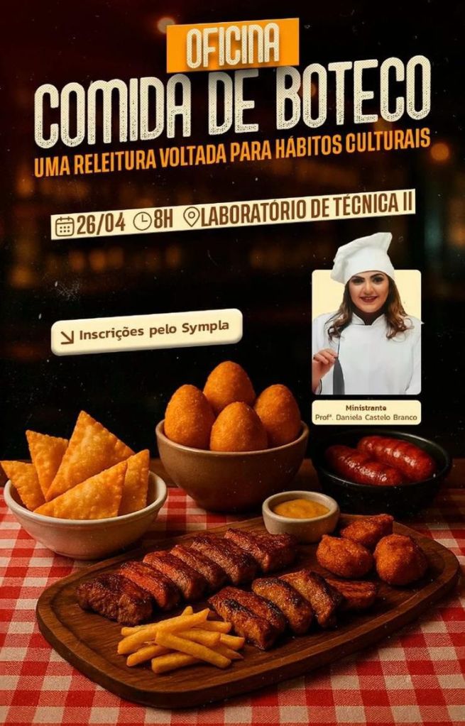 Com carga horária de 4h30 e investimento de R$ 120,00, a oficina tem vagas limitadas. As inscrições podem ser feitas até o dia 22 de abril pela plataforma Sympla, no link: sympla.com.br/evento/comida-de-boteco-uma-releitura-voltada-para-habitos-culturais/2900578