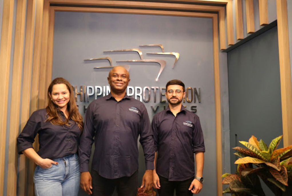 O CEO da Shipping Protection Kledilton Cutrim Pinto entre os membros do Comitê de Sustentabilidade da empresa, formado pela Ger. Financeira Franciane Mendes e pelo Coord. de ESG Paulo Renato Lemos.