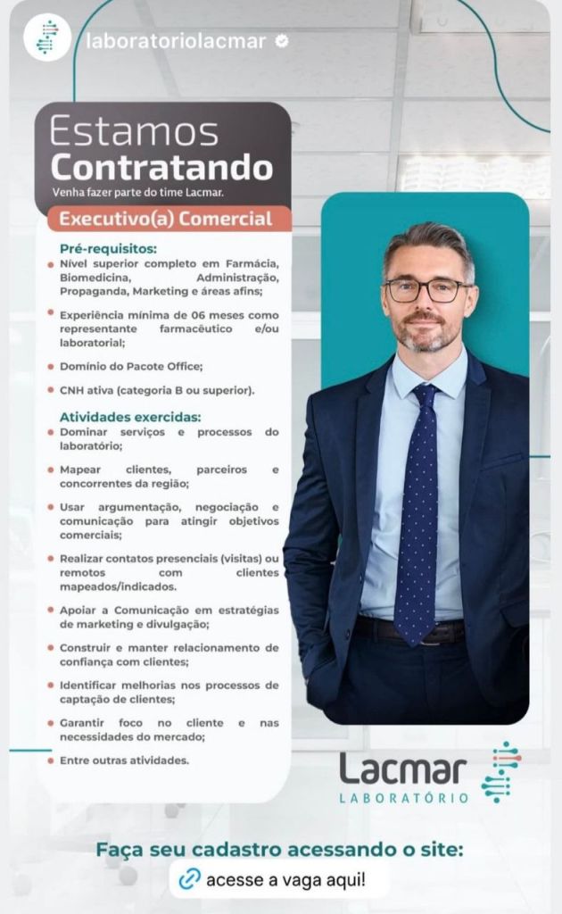 Interessados devem enviar currículo para o e-mail de recrutamento do laboratório, com o assunto “Vaga Executivo(a) Comercial – Lacmar”.