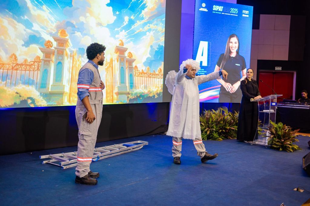 Na sequência, a peça teatral “Um Anjo de Plantão”, do Grupo Sandy Santana Produções, abordou de forma lúdica o comportamento seguro no trabalho, mostrando a importância de cumprir todas as etapas de segurança, o uso correto dos Equipamentos de Proteção Individual (EPIs) e, assim, voltar para casa todos os dias de forma segura.