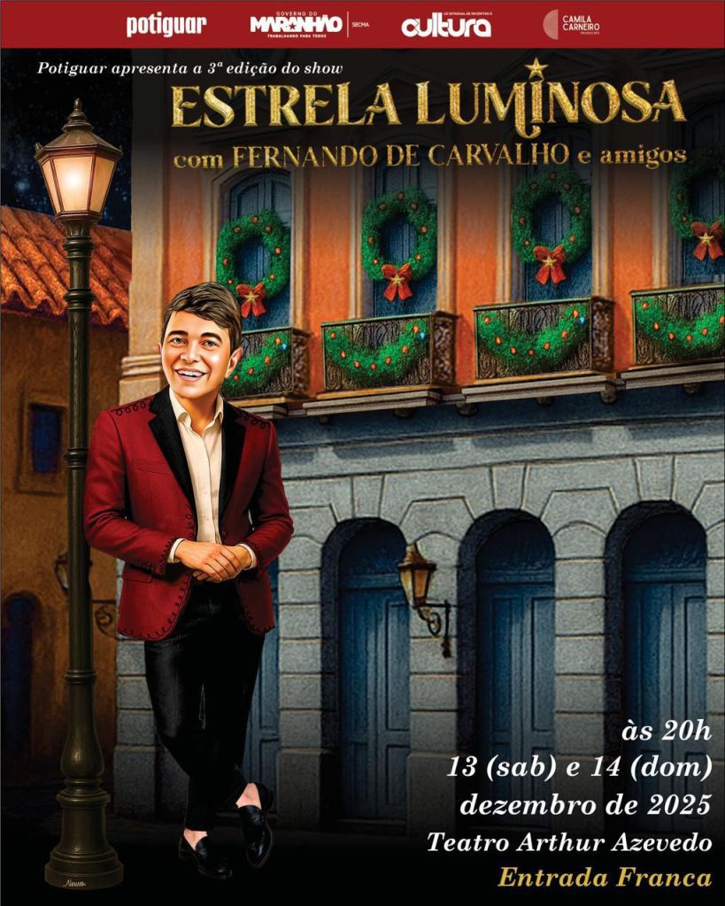Um espetáculo que já virou tradição natalina em São Luís é o show do cantor Fernando de Carvalho “Estrela Luminosa”, que esse ano acontece nos dias 13 e 14 (sábado e domingo) de dezembro, às 20h no Teatro Arthur Azevedo (TAA).