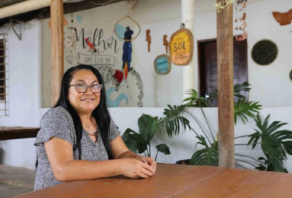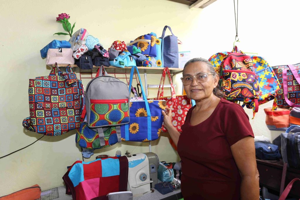 Flor de Lys Pereira de Araújo, 60 anos é uma artesã de sucesso, e confessa que nunca esteve tão feliz. Ela produz bolsas e mochilas no ateliê que montou em sua casa, após fazer um curso de corte e costura ofertado pelo Porto São Luís.